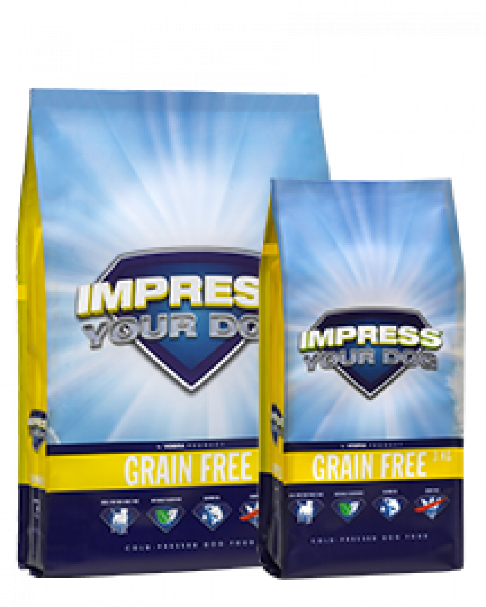 Impress Your Dog Grain Free is een geperst en volledig diervoeder voor volwassen honden. Het voer is geschikt voor honden met een overgevoeligheid voor granen of gluten. Het recept is ontwikkeld ter ondersteuning van een gezonde maag- en darmfunctie bij honden.