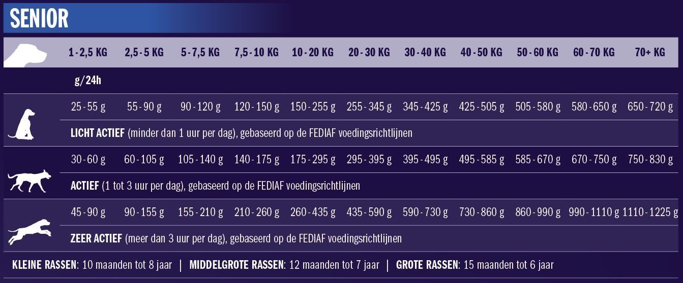 In onderstaand voerschema vind je heel gemakkelijk een passende voergift voor je hond. Zoek in de bovenste balk het actuele gewicht van je hond en kies daar de juiste leeftijd in maanden bij. Je ziet nu heel eenvoudig een geschikte voergift voor je hond per dag. Volg het voerschema in de tabel, maar pas eventueel het schema aan om het ideale gewicht van je hond te handhaven. Verdeel de dagelijkse hoeveelheid voer over twee of meer maaltijden per dag.