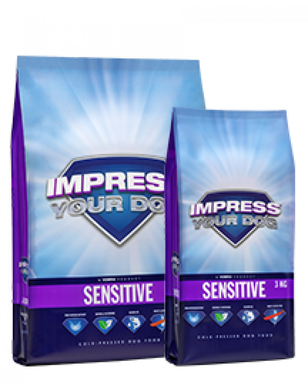 Impress Your Dog Sensitive is een geperst en volledig diervoeder voor volwassen honden van alle rassen ter ondersteuning van een gezonde spijsvertering. Gevoelige maag en darmen resulteren vaak in een verminderde huid- en vachtconditie. Dit voer is hypoallergeen en speciaal ontwikkeld om jouw hond op deze gebieden optimale ondersteuning te bieden.